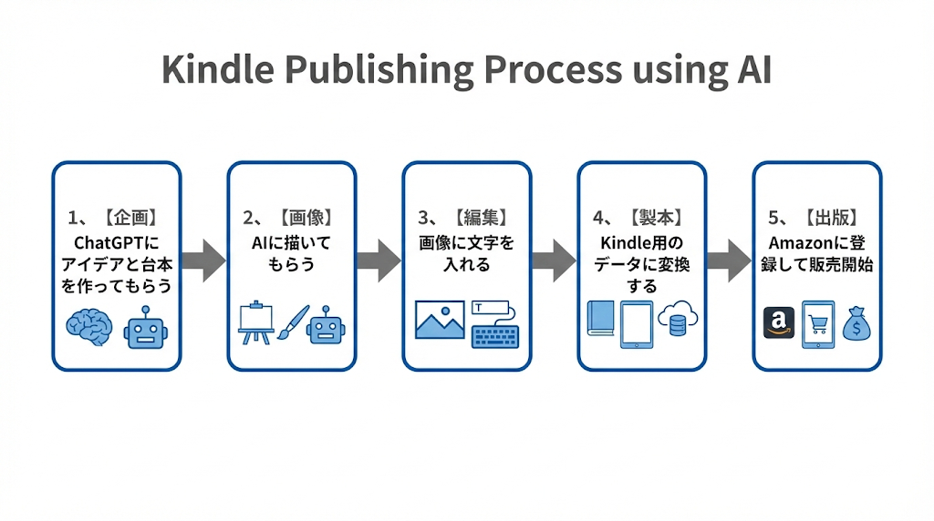 まず、この記事の全体像をお伝えします。難しそうに見える出版作業も、分解すれば以下の5ステップです。