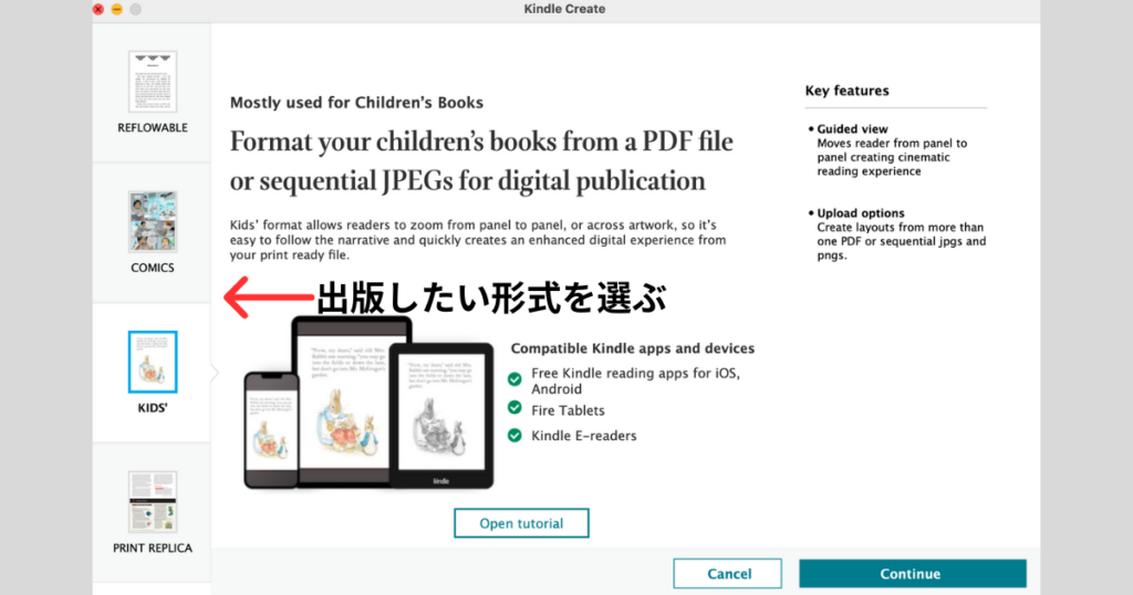 1. 出版する形式を決める Kindle Createを起動し、作成する本のタイプを選びます(通常は「コミック」や「絵本」の設定を選びます)。