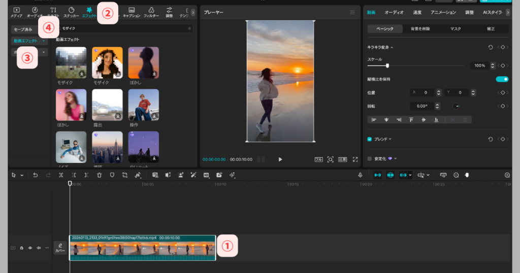 3. 「モザイク」を選んで上の動画にドラッグ&ドロップで重ねる