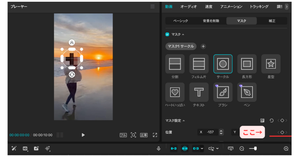 3. キーフレーム: 右側パネルの「基本」→「マスク」→「位置」の横(Web版と同じ)