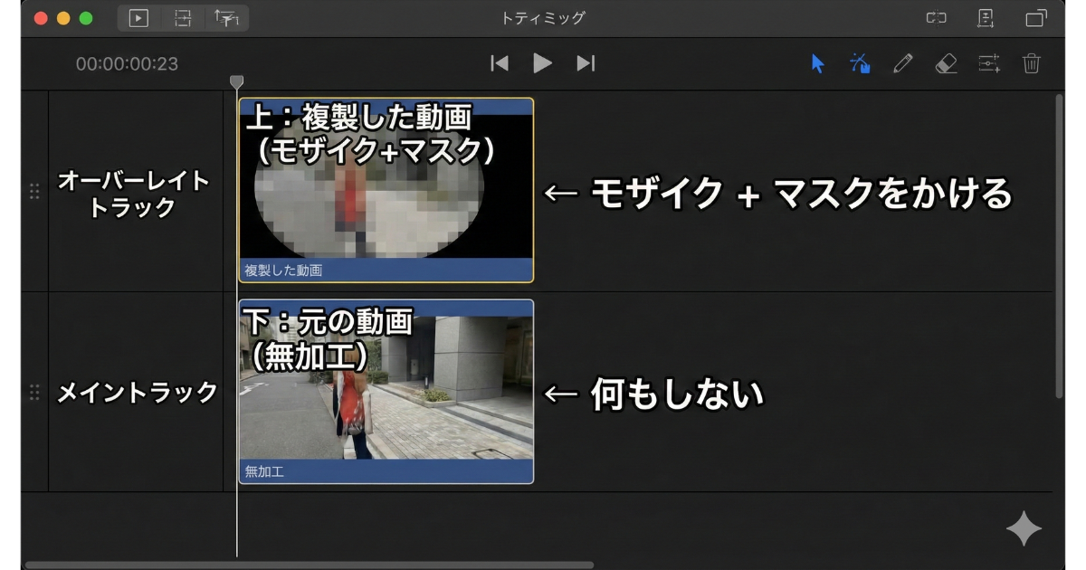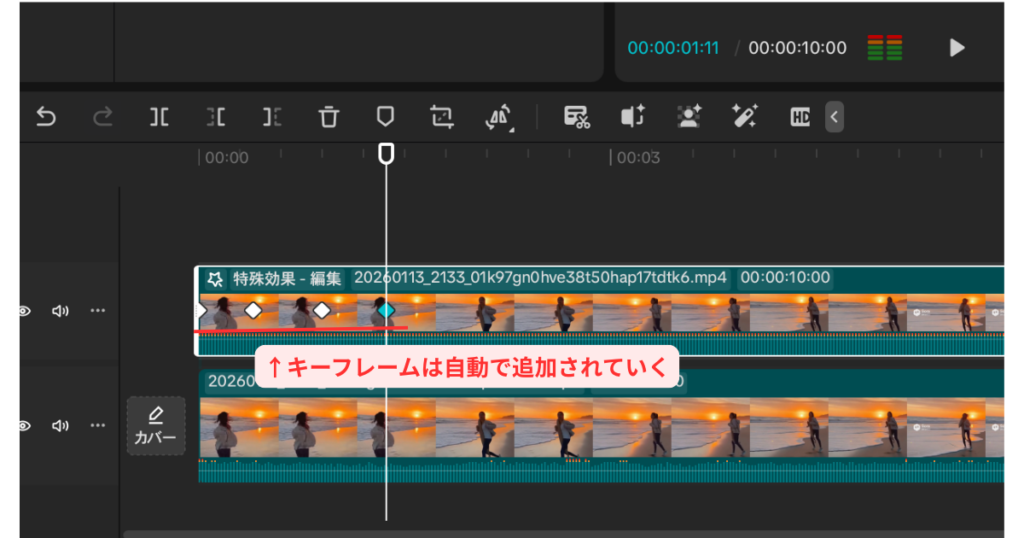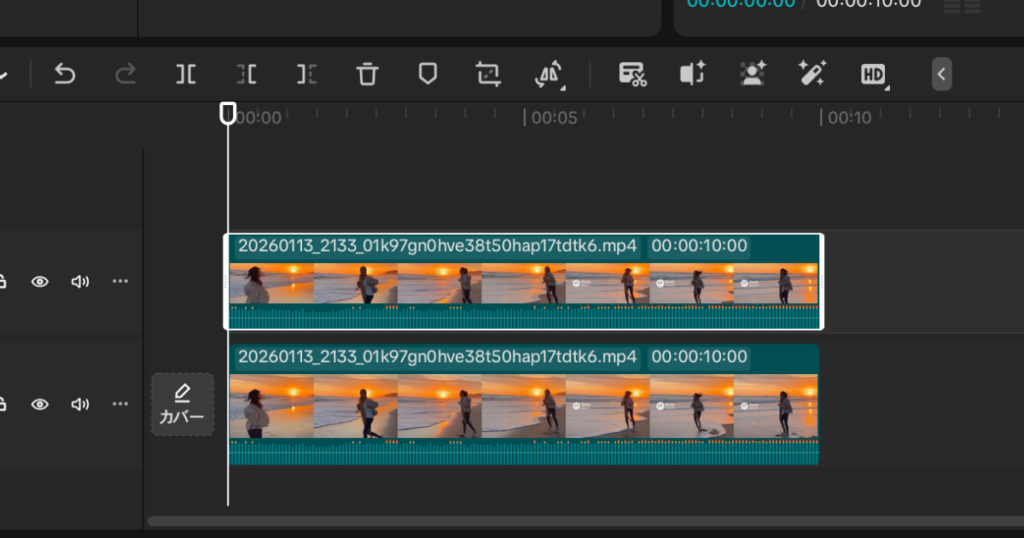 3. 複製された動画が上のレイヤー(オーバーレイトラック)に自動配置される