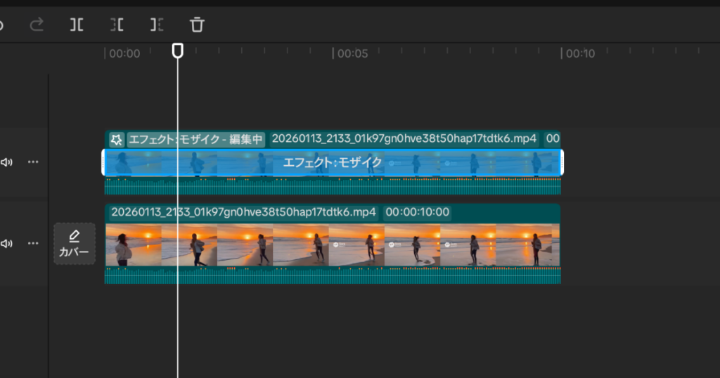 1. エフェクトのかけ方: 上の動画にモザイク+マスク(Web版と逆!)