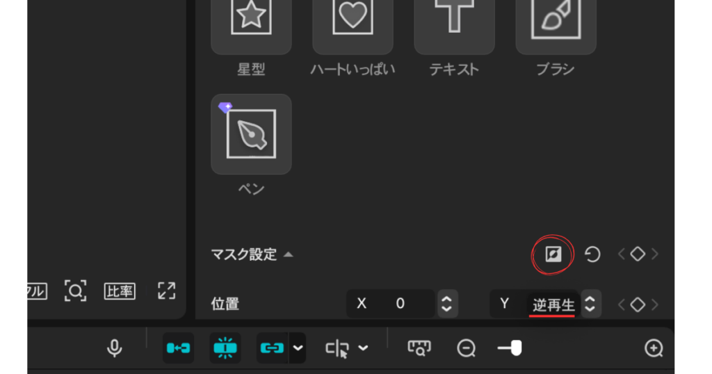 2. 「反転」の場所: マスク形状選択の下のアイコン(「逆再生」みたいな表示)