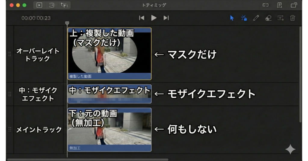 モザイクの適用方法下の動画にエフェクト、上の動画にマスク上の動画にエフェクトとマスク両方