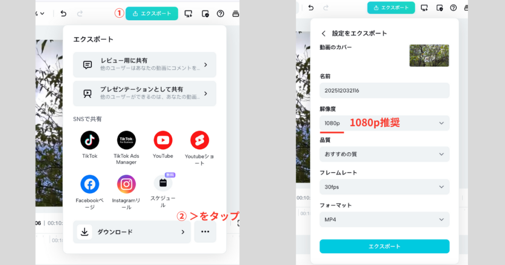 対処法: エクスポート画面で、解像度を「1080p」(または720p)に変更してください。