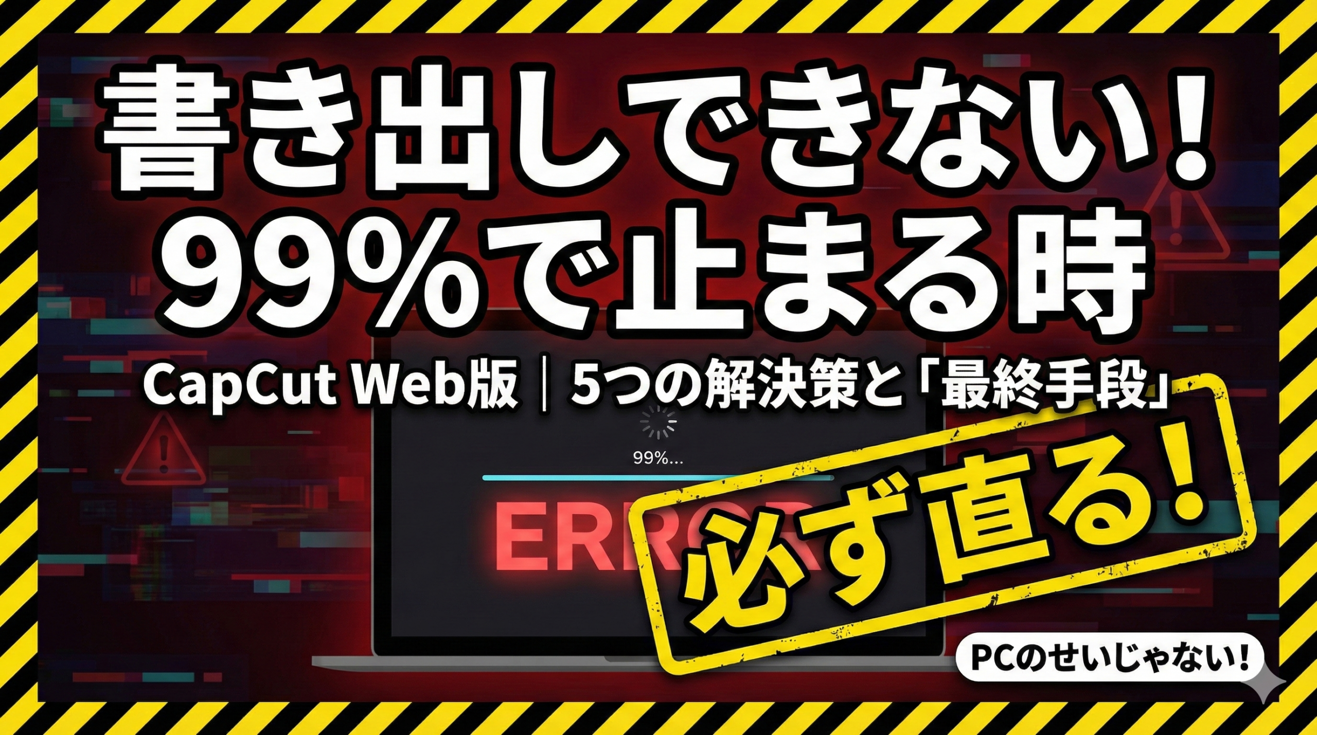 書き出しエラーの犯人は、大抵「Wi-Fiの不安定さ」か「4Kなどの高画質すぎ」です。まずは画質を「1080p」に落とし、ブラウザを更新(再読み込み)してみてください。