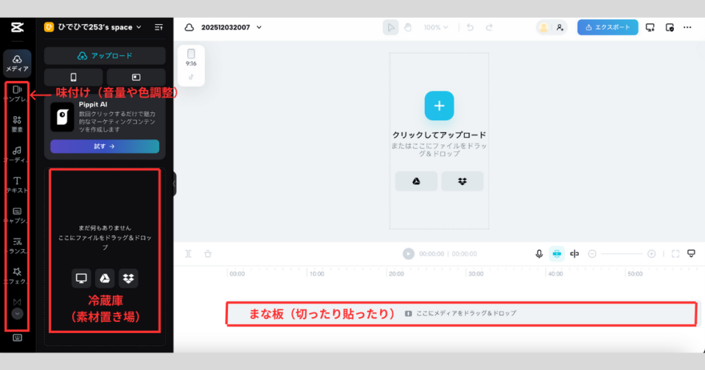 - 左側(冷蔵庫): 動画とか音楽とか、素材を選んで持ってくる場所。