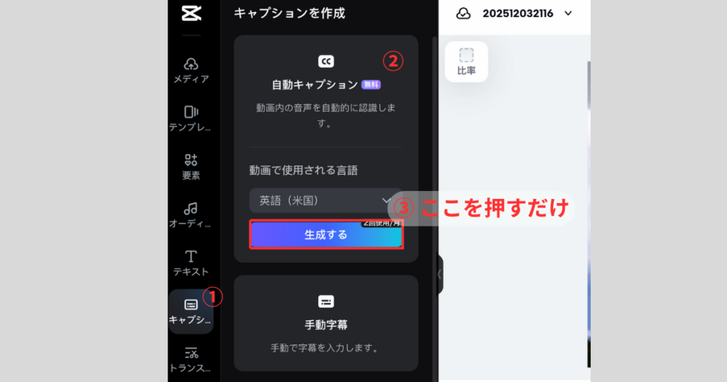 - 「自動キャプション」の「生成」ボタンをポチッ。