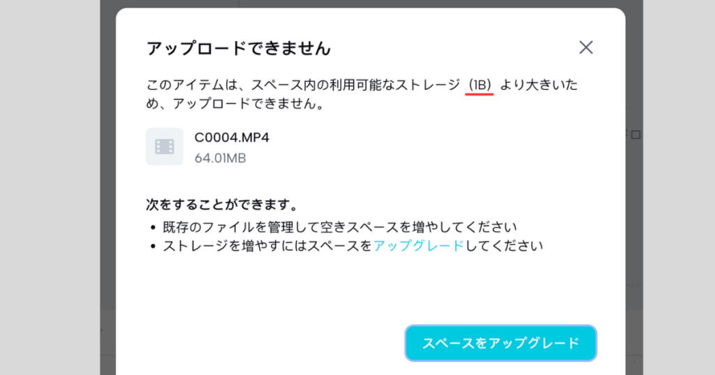 まだ何も動画を入れてないのに、画面にこんなエラーが出たんです。 「スペースに空き容量がありません(利用可能:1B)」