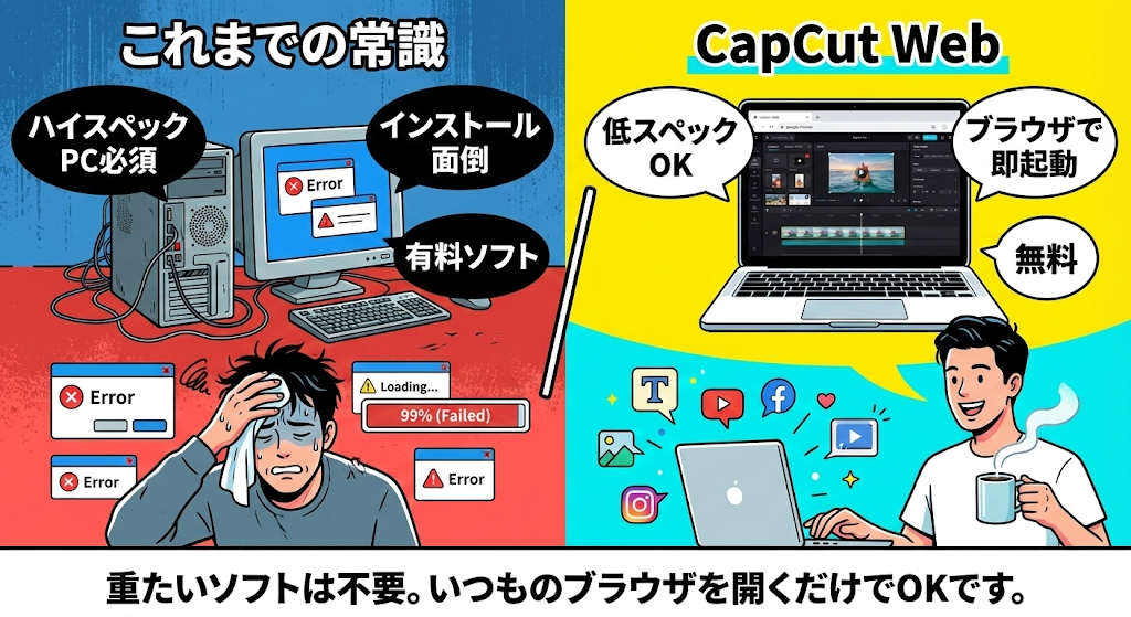 CapCut Web版は、私たちのような「そこそこのPC」しか持ってないおじさんの救世主です。