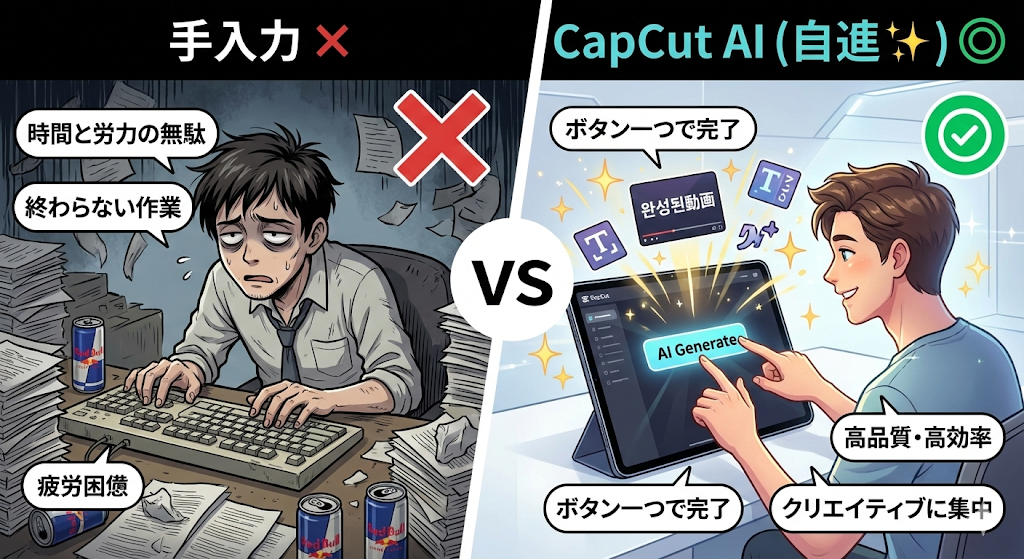 CapCut Web版なら、「AIに生成させる→スタイルを一括適用する→誤字を直す」の3ステップで終わります。
