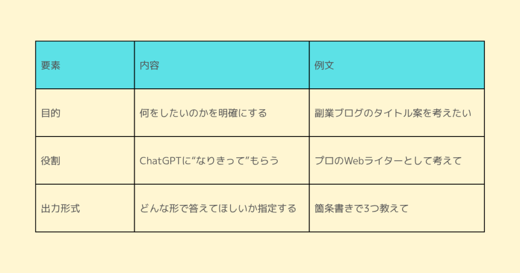 目的を伝えることで、ChatGPTはゴールを理解し、答えが的確になります。